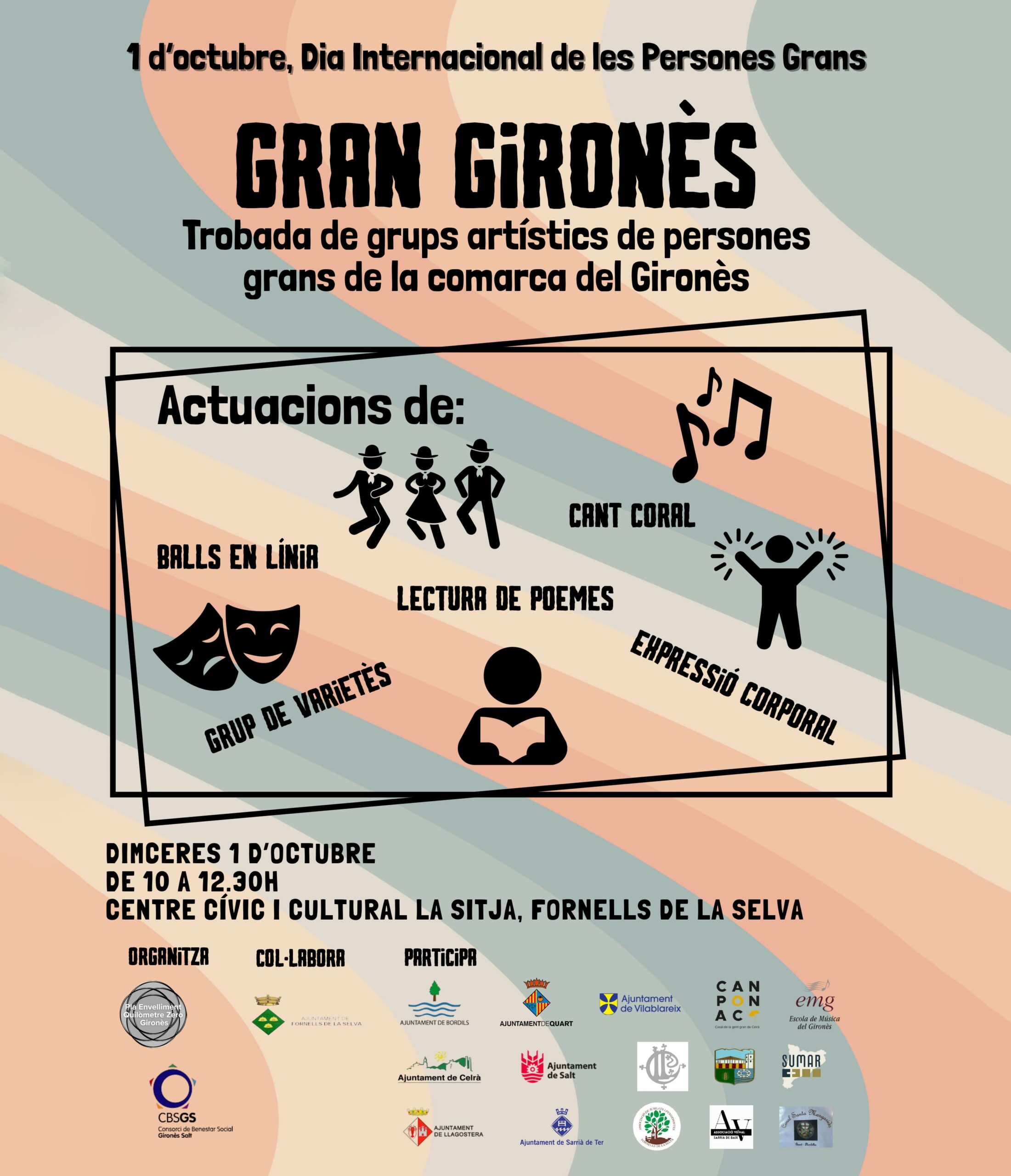 Tots els dimecres de 8 a 9 del matíTrobada de grups artístics de persones grans de la comarca del Gironès. Actuacions de balls en línia, lectura de poemes, cant coral, grup de varietés i expressió corporal