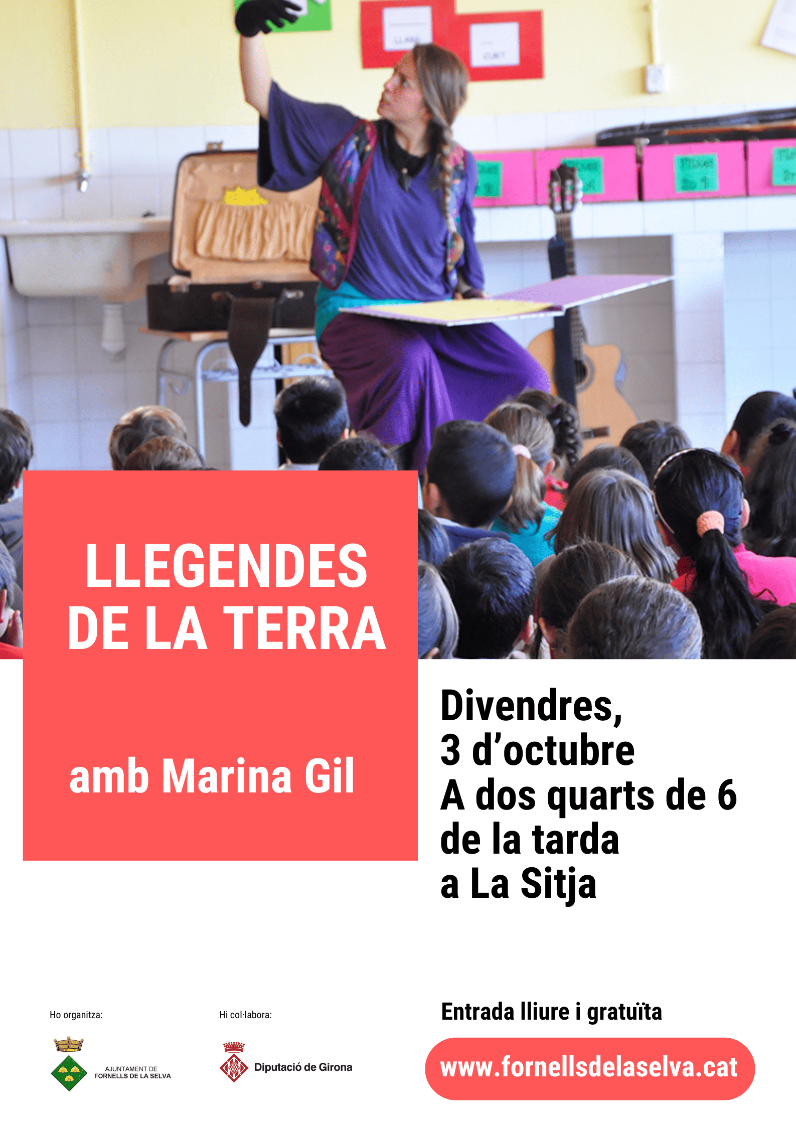 Diumenge 5 d'octubre a les 6 de la tardaMarina Gil “Llegendes de les Gavarres” Sessió d’històries que són «veritats tan certes que mai han passat», inspirat en llegendes del territori entre el Ter i les Gavarres. Les acompanyen també contes que parlen de la fauna i la flora autòctona i els orígens d’algunes tradicions. Per nens a partir de 3 anys.