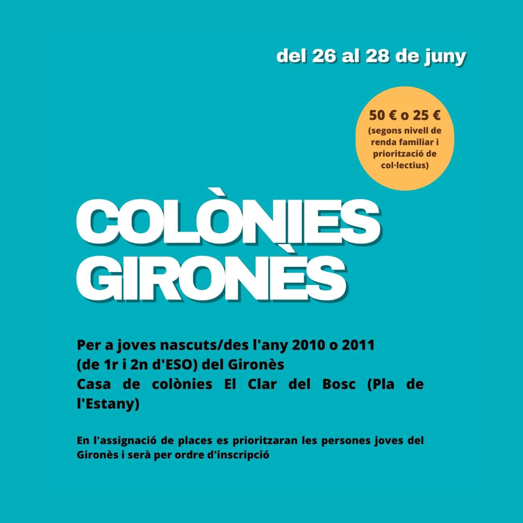 Els dimarts i dijous de juliol, de 16.30 a 19.00 hPer a joves nascuts/des l’any 2010 o 2011 (1r i 2n d’ESO) del Gironès, del 26 al 28 de juny. Casa de colònies: El Clar del Bosc (Pla de l’Estany) En l’assignació de places es prioritzaran les persones joves del Gironès i serà per ordre d’inscripció Preu: 50€ o 25€ (segons nivell de renda familiar […]