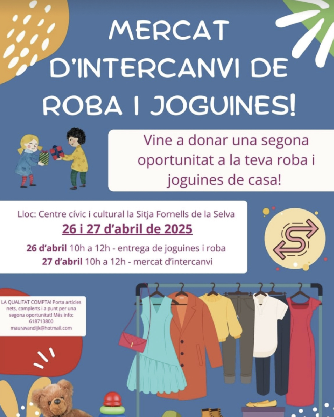 Agenda Mercat d’intercanvi de joguines i roba Dissabte 26 i diumenge 27 d'abril de 10 a 12 del matí | La Sitja Vine a donar una segona oportunitat a la teva roba i joguines de casa! Dissabte 26 d’abril de 10 a 12 del matí entrega de roba i joguines. Diumenge 27 d’abril de 10 a 12 del matí mercat d’intercanvi de joguines i roba < Entrada AnteriorEntrada Posterior >
