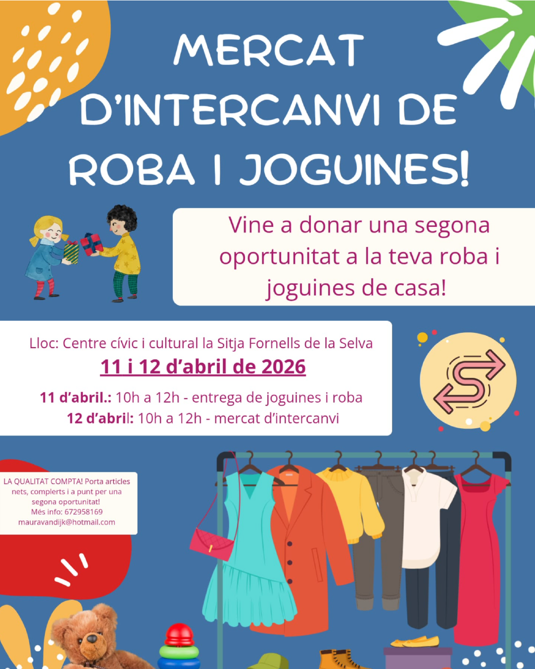Agenda Mercat intercanvi de roba i joguines Divendres 11 i dissabte 12 d'abril, de 10 a 12 del matí | La Sitja Vine a donar una segona oportunitat a la teva roba i joguines de casa! 🗓️Divendres 11 i dissabte 12 d’abril 🕐De 10 a 12 del matí 📍La Sitja Organitza: veïns i veïnes del poble Col·labora: Ajuntament de Fornells < Entrada Anterior