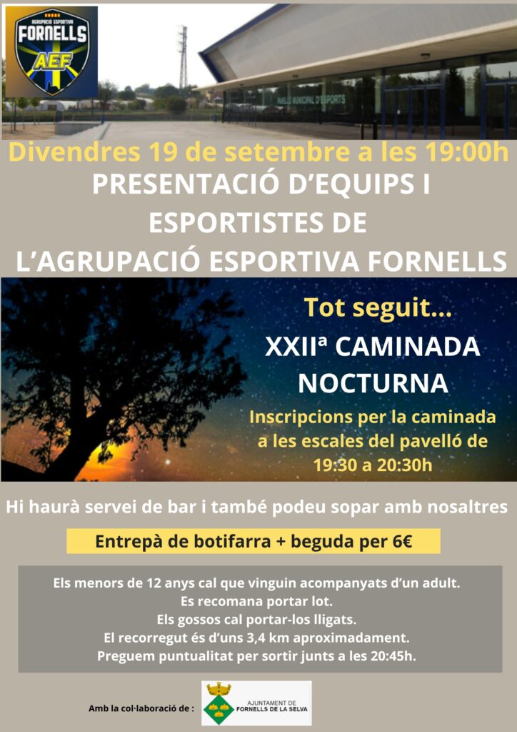 Agenda Presentació d’equips i esportistes de l’Agrupació Esportiva Fornells i Caminada nocturna Divendres 19 de setembre a les 7 de la tarda | Pavelló Poliesportiu Ho organitza: Agrupació Esportiva Fornells Hi col·labora: Ajuntament de Fornells de la Selva < Entrada AnteriorEntrada Posterior >