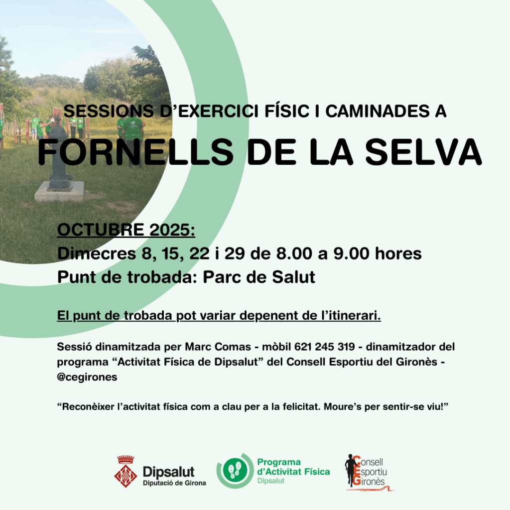 Sessions dirigides d’exercici físic i caminades (marxa nòrdica), adreçades a millorar la condició física de la persona i l’estat de salut general, incloent-hi la dimensió psicològica, social, espiritual i planetària.
