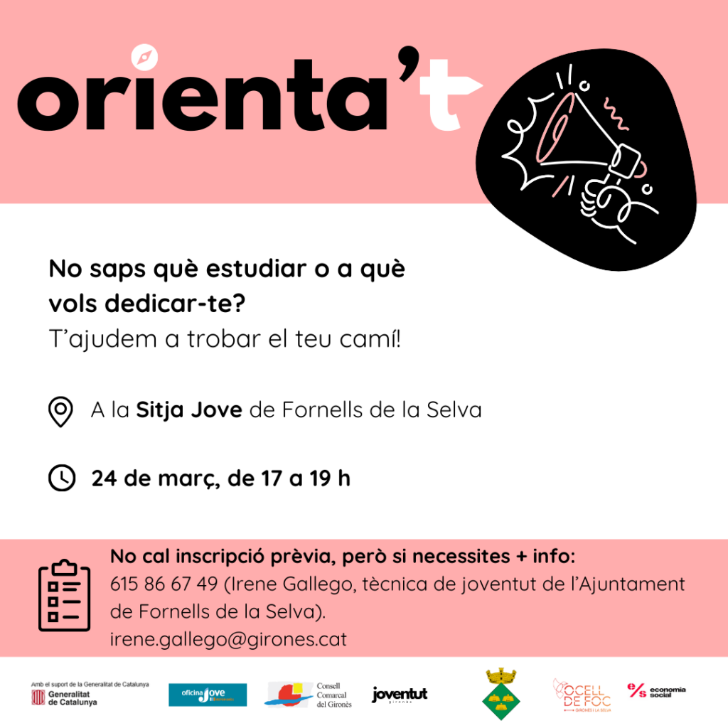 Vine el dimarts 24 de març a la Sitja Jove de Fornells, de 17 a 19 h, i t’ajudarem a trobar el teu camí. Un espai per orientar-te i reflexionar.