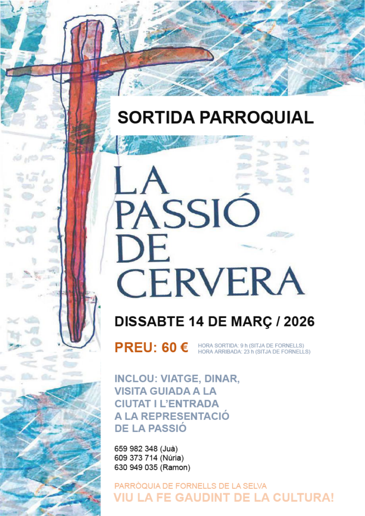 Agenda Sortida Parroquial. La Passió de Cervera Dissabte 14 de març a les 9 del matí | La Sitja Inclou: viatge, dinar, visita guiada i entrada a la representació de la Passió. < Entrada AnteriorEntrada Posterior >